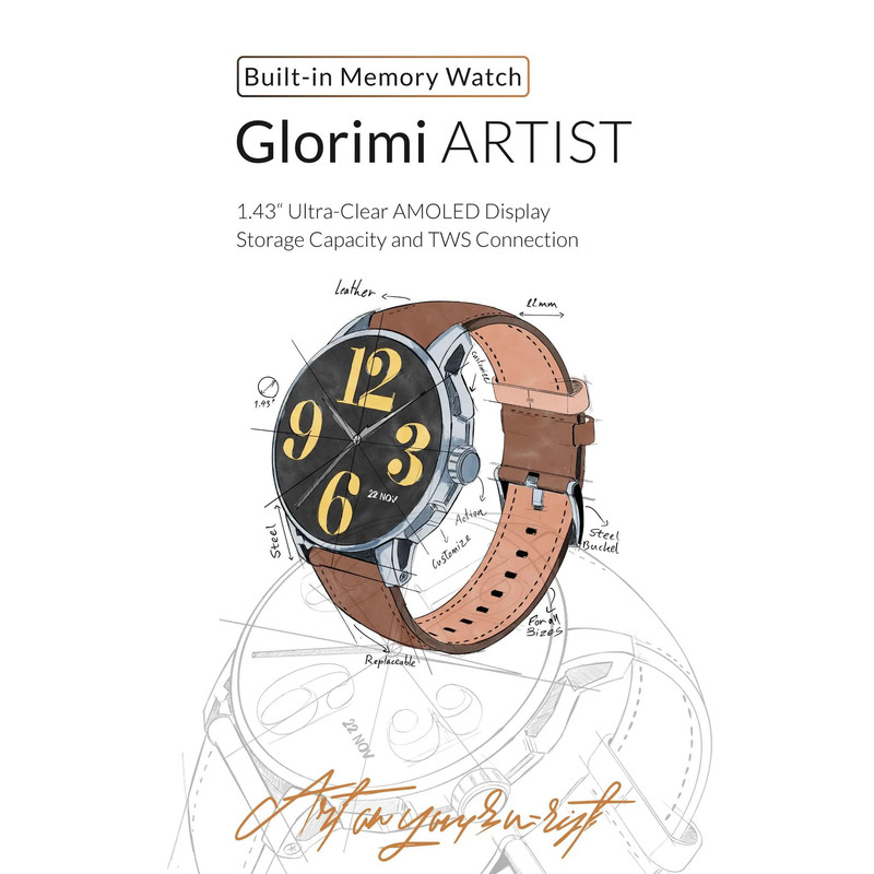 ساعت Glorimi Artist دارای بدنهای با ترکیب مواد آلیاژی (آلیاژ روی / آلومینیوم) است که در بررسیها به عنوان «زیبای چشمگیر» توصیف شده است. نمایشگر 1.43 اینچی آمولد نیز ظاهری واضح و مدرن ارائه میدهد. -