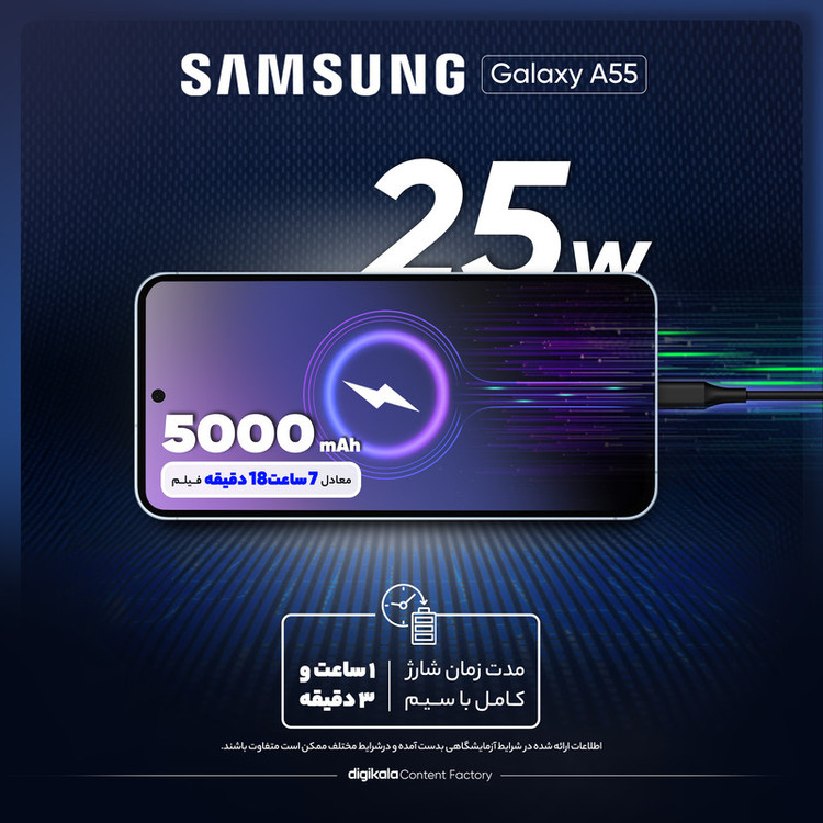 طراحی فلزی و شیشهای: بدنهی فلزی این مدل در مقایسه با نسل قبلی (A54) حس یک گوشی پرچمدار را منتقل میکند. سامسونگ در طراحی A55 سنگ تمام گذاشته است.